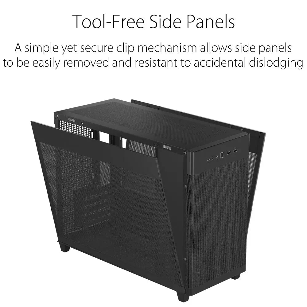 ASUS Cabinet comes with Tool-Free Side Panels, a simple yet secure clip mechanism allows chassis side panels to be easily removed and resistant to accidental dislodging.
