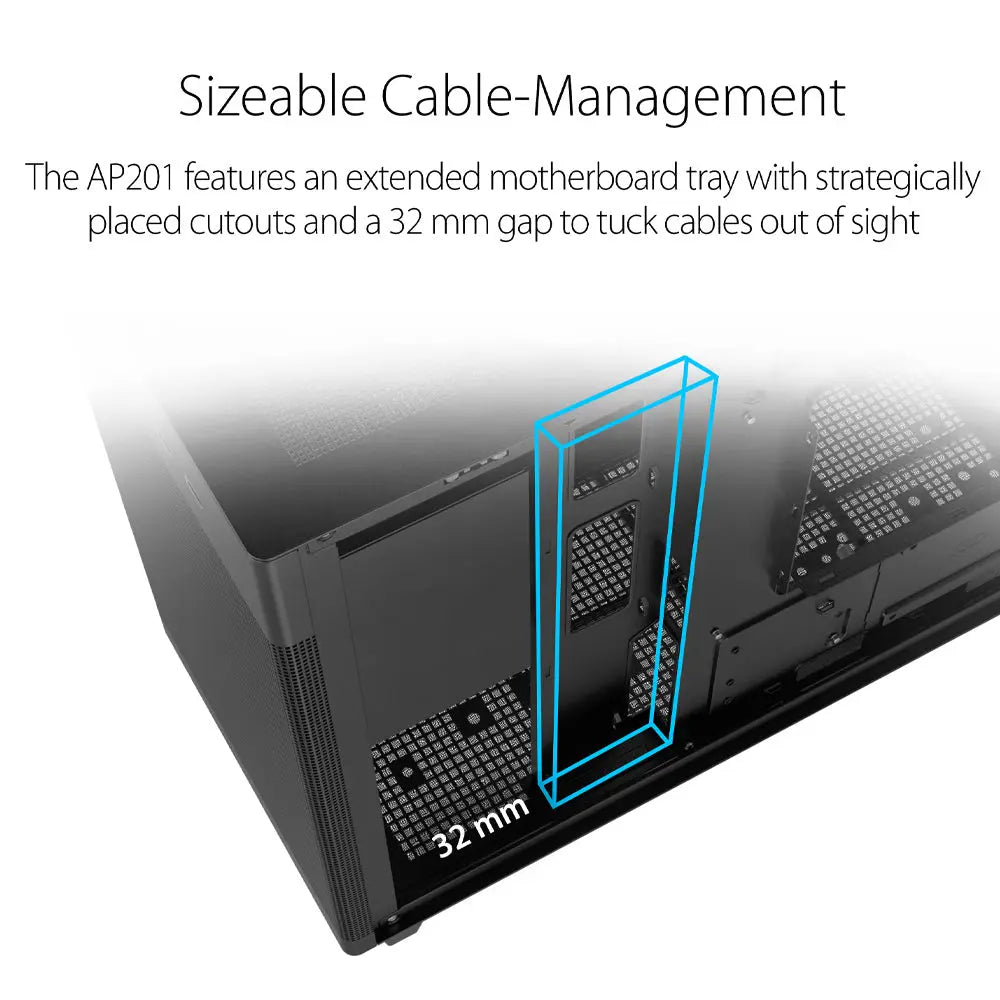 The ASUS Micro-ATX Cabinet features an extended motherboard tray with strategically placed cutouts and a 32 mm gap to tuck cables out of sight.