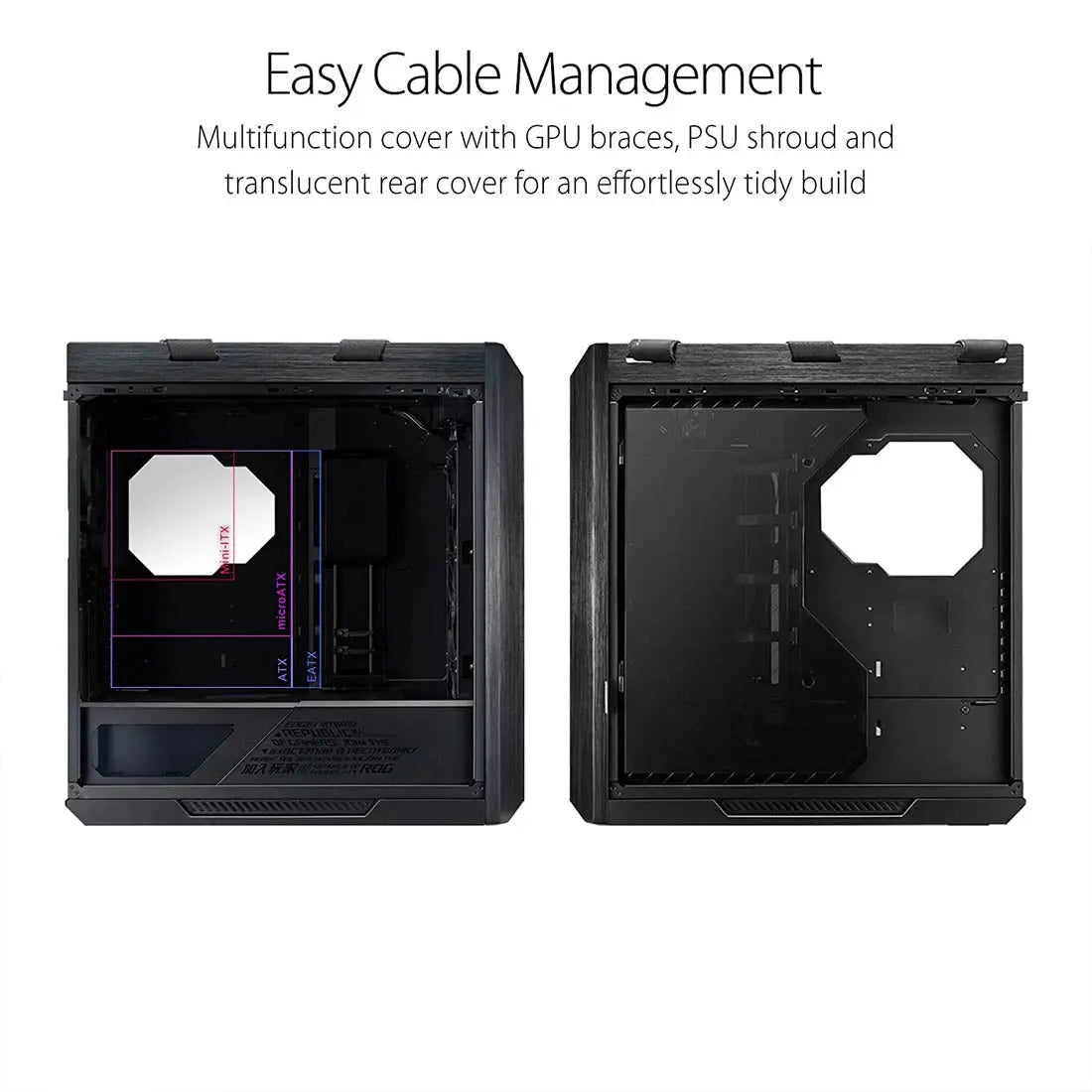 ROG Strix Helios is a premium mid-tower gaming case with three tempered-glass panels, refined aluminum frame and integrated front-panel RGB lighting. Built-in cable management, including a multifunction cover with GPU braces, keeps the interior sharp and tidy.Engineered for expandability and performance, it's ready for an up to EATX motherboard and serious water-cooling setups.