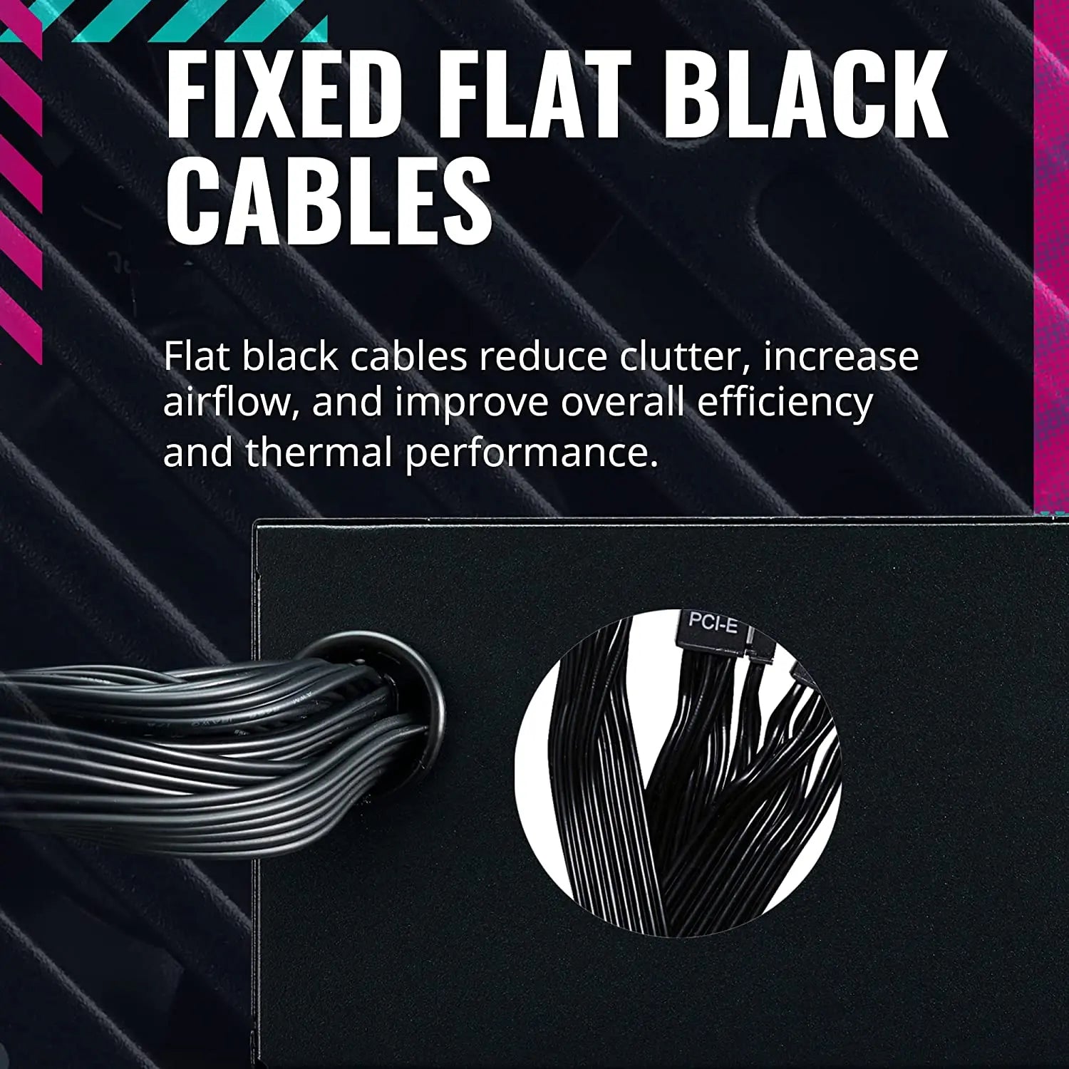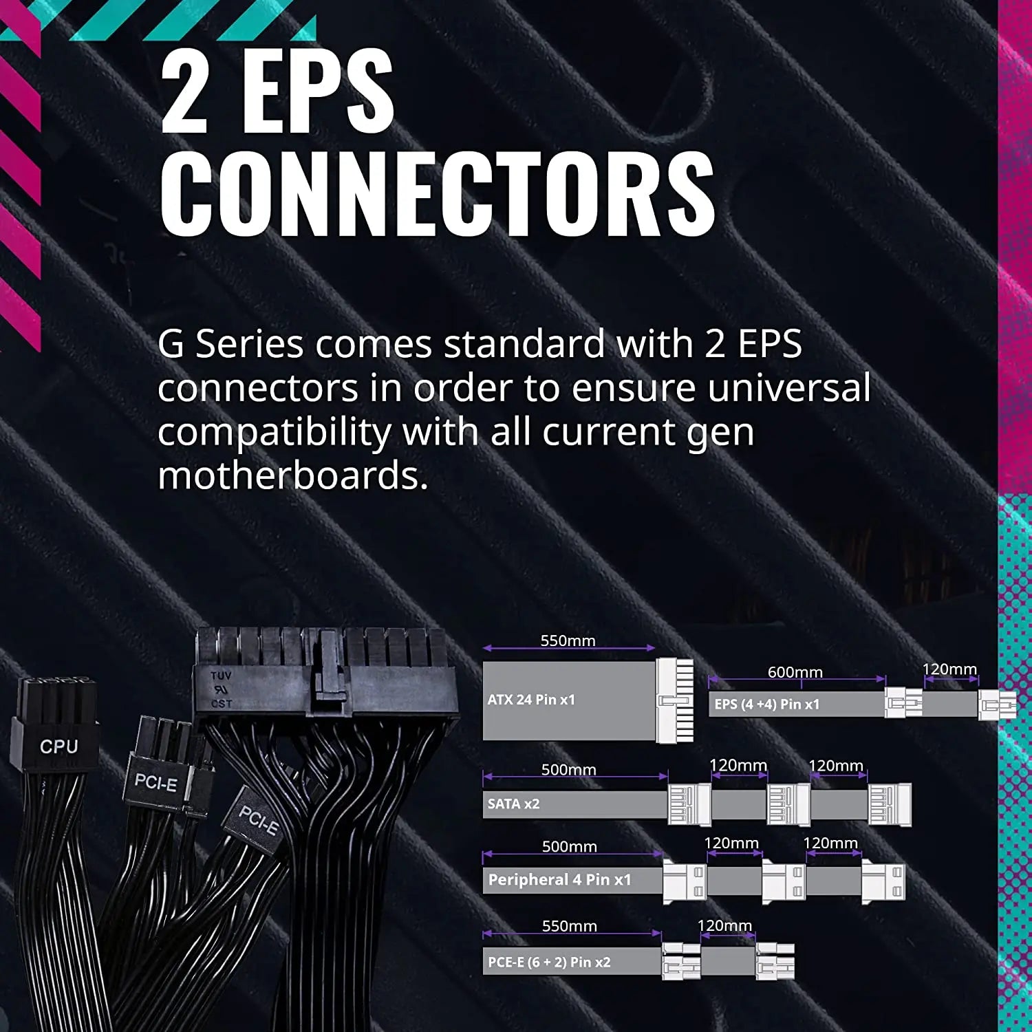 The Non-Modular SMPS gives extended connectivity with 6x SATA, 3x Peripheral 4-Pin, 4x 6 PCI-e+2 Pin connectors and 1x ATX 24 Pin, EPS 4+4 Pin & EPS 8 Pin giving guaranteed universal compatibility with all major motherboards.