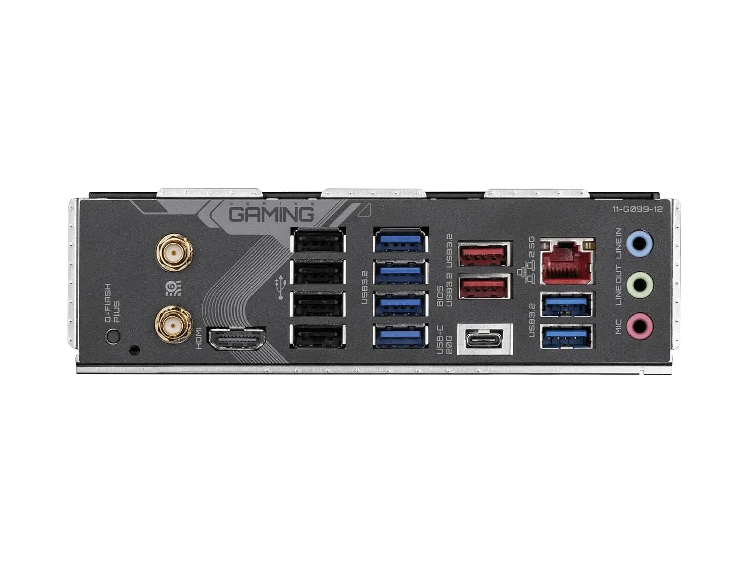 | Back Panel Connectors | 1 x Q-Flash Plus button 2 x SMA antenna connectors (2T2R) 1 x HDMI port 6 x USB 3.2 Gen 1 ports 4 x USB 2.0/1.1 ports 2 x USB 3.2 Gen 2 Type-A ports (red) 1 x USB Type-C® port, with USB 3.2 Gen 2x2 support 1 x RJ-45 port 3 x audio jacks |