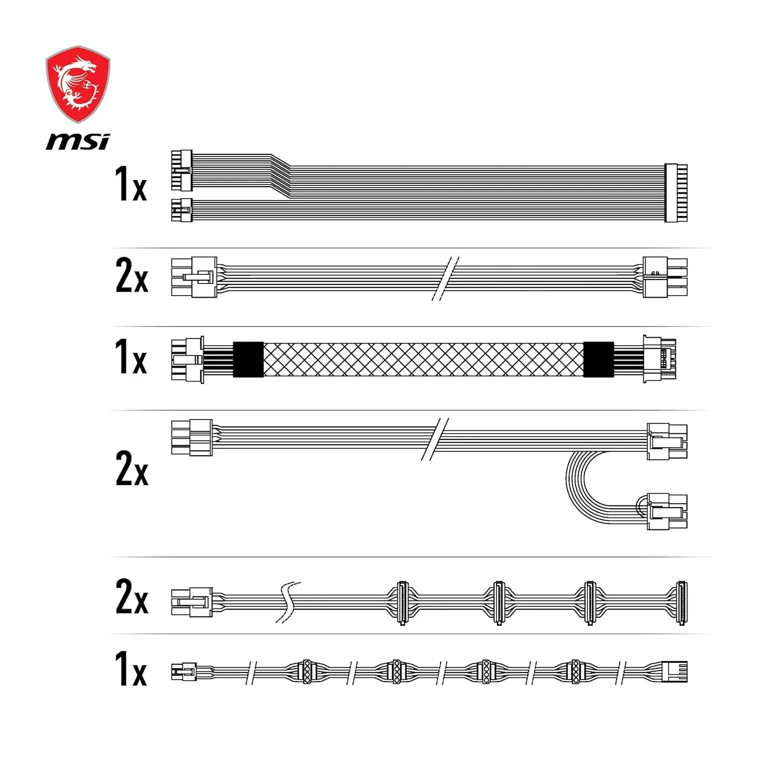 | Connectors | ATX (24 pin) x 1 EPS (4+4 pin) x 2 PCI-E 5.0 (16 pin) x 1 (600W) PCI-E (6+2 pin) x 4 SATA (15 pin) x 8 MOLEX (4 pin) x 4 FDD (4 pin) x 1 |